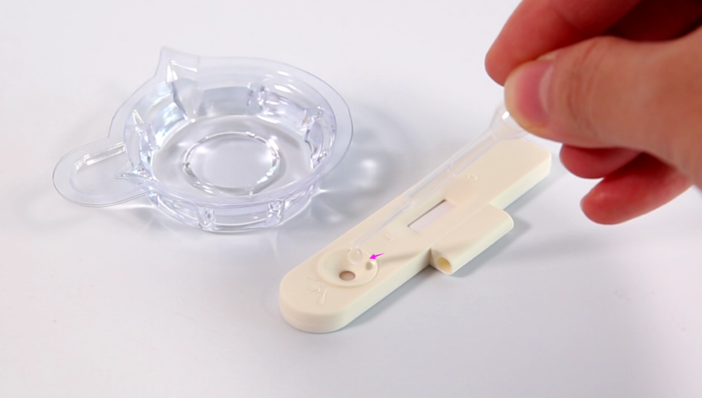 2. Holding a sample dropper vertically, add 2-3 drops of the urine specimen to the sample well (with an arrow marked).
